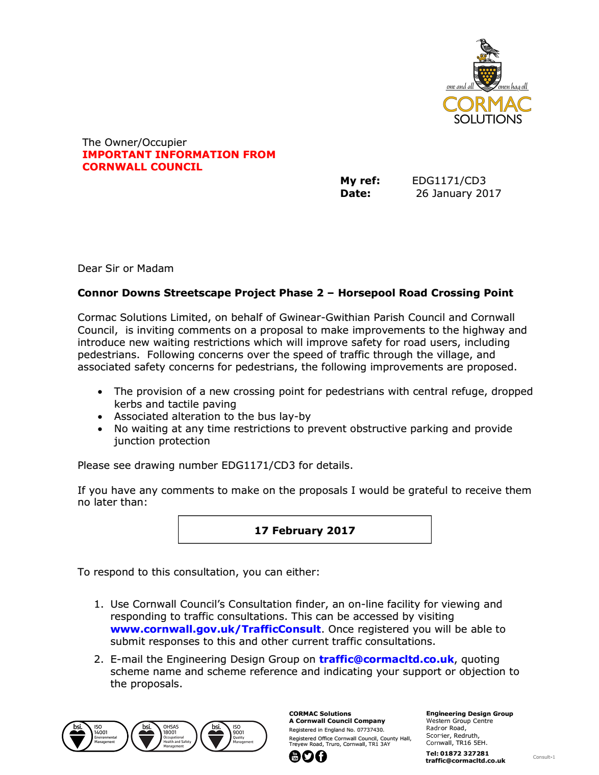 - 170126 | Consultation Connor Downs, Horsepool Road Pedestrian Crossing Works - Streetscape Projects Phase 2 (EDG1171/CD3) (Regio