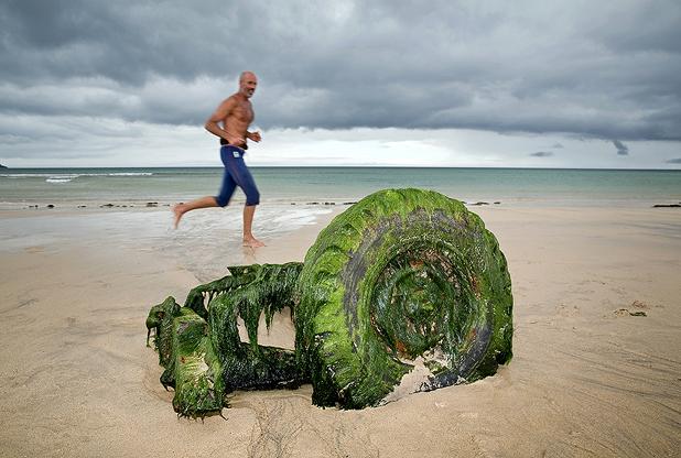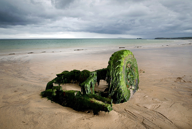 Upside- down and buried at the low water line on Gwithian beach below Mexico Towans and Beachside Holiday Park, the Land Rover has been stuck there since January 13, 1990.