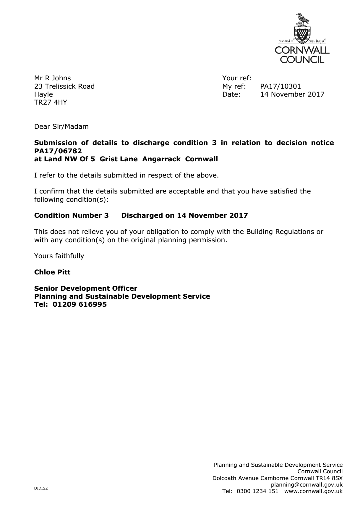 - Condition 3 discharged | PA17/06782 | Submission of details to discharge condition 3 in relation to decision notice