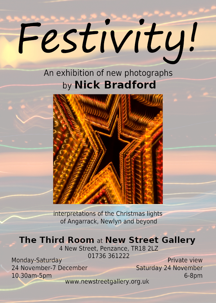 Everybody is warmly invited to attend “Festivity! Interpretations of the amazing Christmas lights of Angarrack, Newlyn and beyond” This is a photographic exhibition by Nick Bradford in the third room at New Street Gallery in Penzance that celebrates the ingenuity of the lights’ creators, while presenting the amazing light displays as they’ve never been seen before. Angels come alive, stars explode and snowflakes dance. The images are startlingly fresh as Nick experiments with his camera to create vivid new imagery - without the aid of Photoshop!