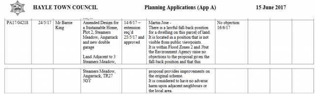 | PA17/04218 | 24/5/17 | Mr Barrie King | Amended Design for a Sustainable Home, Plot 2, Steamers Meadow, Angarrack and new double garage Land Adjacent to 3 Steamers Meadow, | 14/6/17 – extension req’d 25/5/17 and approved | Martin Jose - There is a lawful fall - back position for a dwelling on this parcel of land. It is located in a position that is not visible from public viewpoints. It is within Flood Zones 2 and 3 but the Environment Agency raise no objections to the proposal given the fall - back position and that this proposal provides improvements on the original scheme. It is considered to have no adverse harm upon adjacent neighbours or the local area. | No objection 16/6/17 | |||