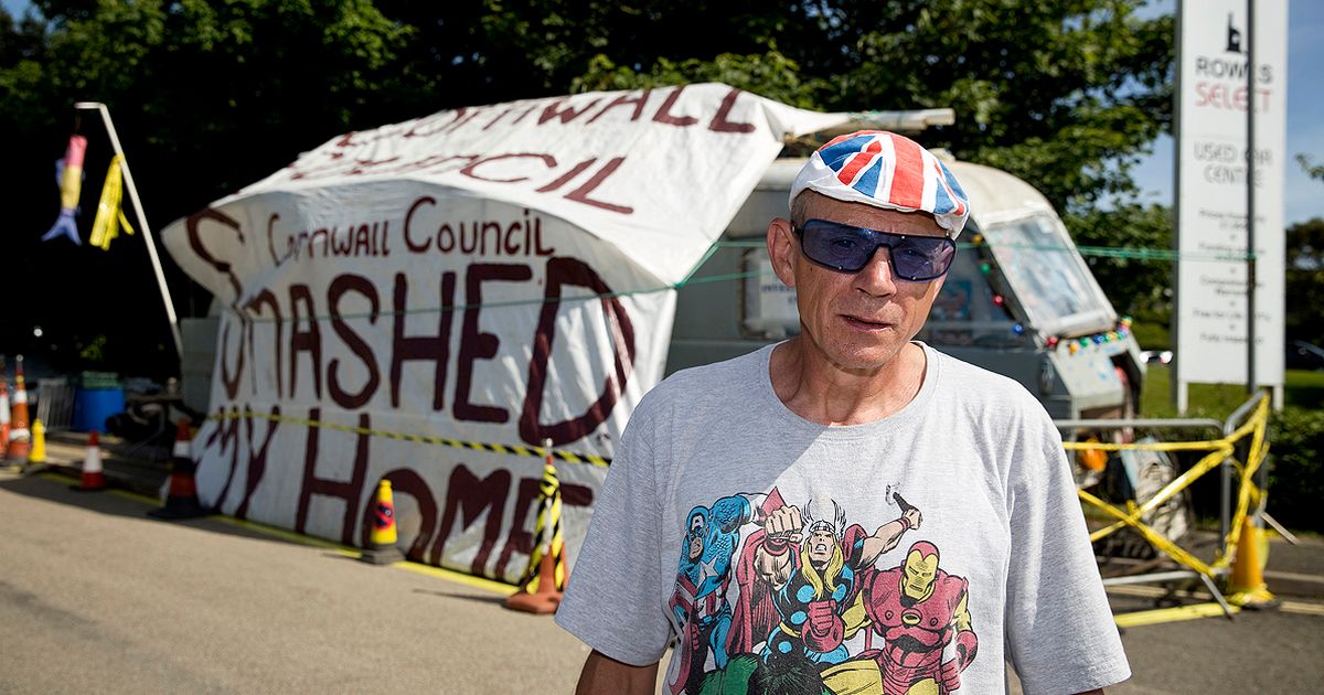 Neil Wainwright has also draped a large banner over his camper van near Hayle saying 'Cornwall Council smashed my home'