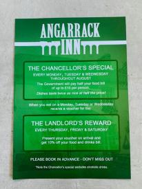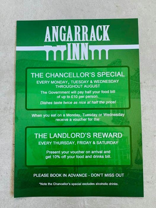 Image may contain: text that says "ANGARRACK TITINNT THE CHANCELLOR'S SPECIAL EVERY MONDAY, TUESDAY WEDNESDAY THROUGHOUT AUGUST The Government will pay half your food bill per person. nice half the price! Dishes taste twice When you on Monday, Tuesday Wednesday receive voucher for the: THE LANDLORD'S REWARD EVERY THURSDAY, FRIDAY & SATURDAY Present your voucher arrival and get 10% off your food and drinks PLEASE BOOK IN ADVANCE DON'T MISS OUT *Note Chancellor's special excludes alcoholic drinks."