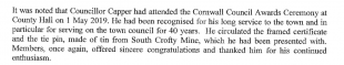 "It was noted that Councillor Capper had attended the Cornwall Council Awards Ceremony at County Hall on 1 May 2019. He had been recognised for his long service to the town and in particular for serving on the town council for 40 years. He circulated the framed certificate and the tie pin, made of tin from South Crofty Mine, which he had been presented with. Members, once again, offered sincere congratulations and thanked him for his continued enthusiasm."