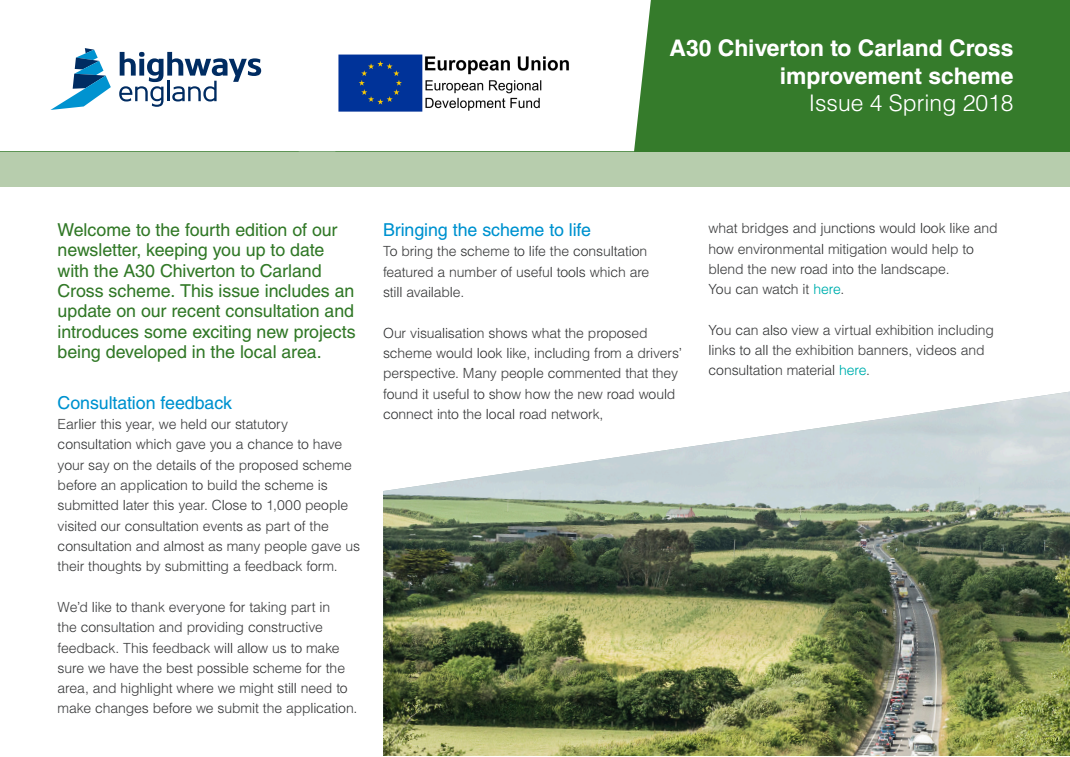 The statutory consultation on the A30 Chiverton to Carland Cross dualling scheme has now closed. We’d like to thank everyone who participated in the consultation, using the opportunity to speak to the project team and share their feedback on the proposal. We will now consider all the responses very carefully before moving onto the next stage of the scheme development.