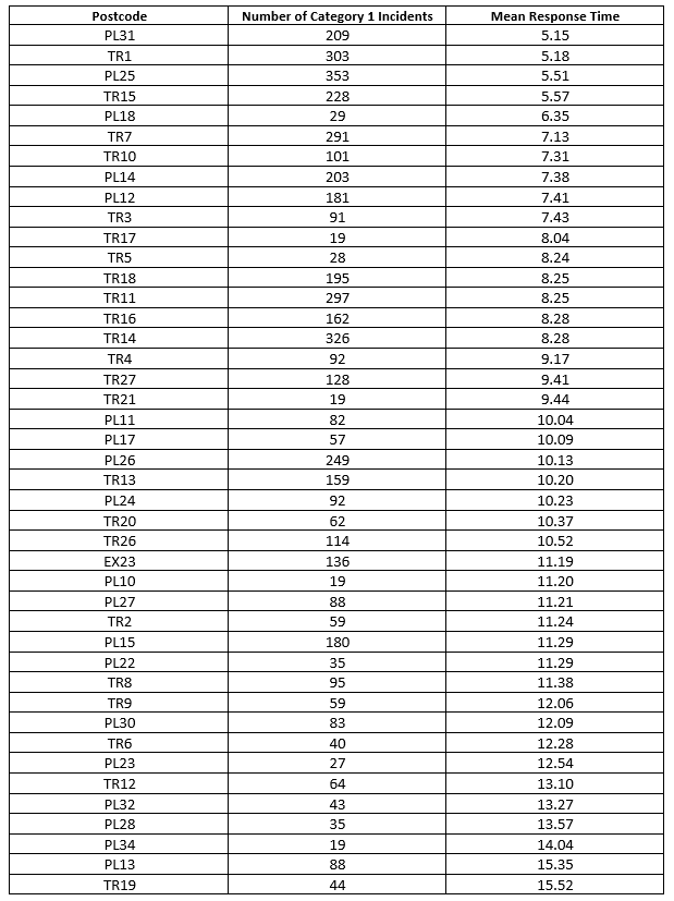 Full list of average response times to Category 1 calls in Cornwall by postcode, from quickest to slowest (June 2018 to May 2019)