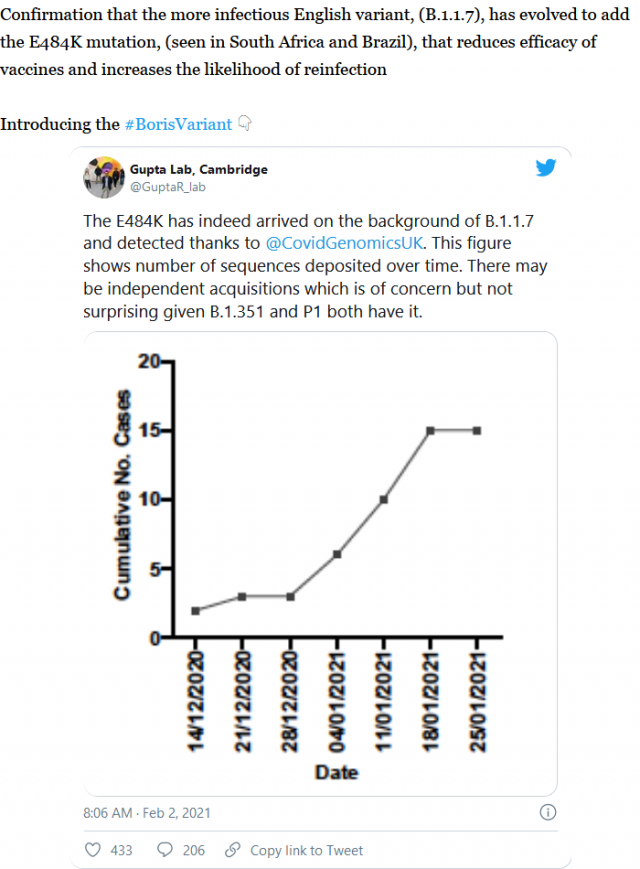 The B.1.1.7, (English variant), is believed to be upto 70% more transmissible and 65% more deadly...and it now seems a new UK variant has evolved to add the E484K mutation, that reduces antibody/vaccine efficacy by ~50%