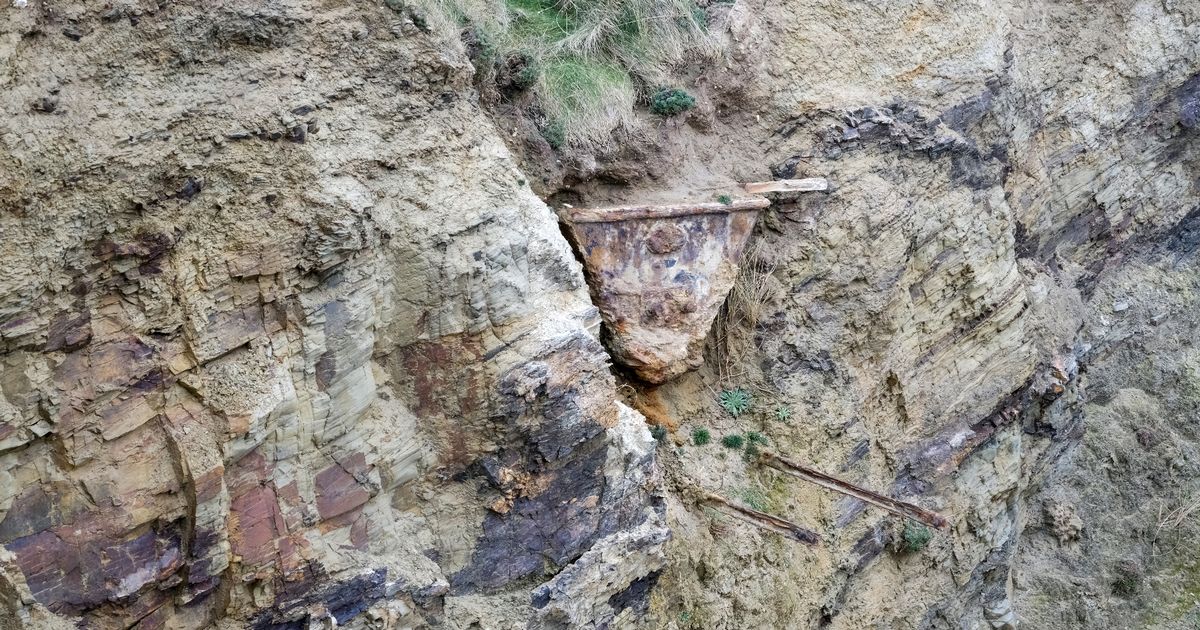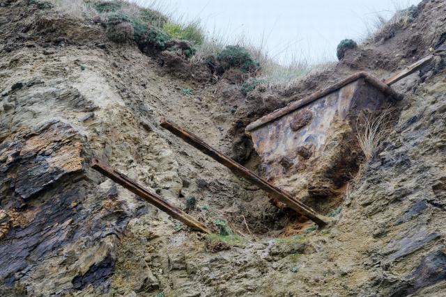 A 100-year-old cart is emerging from a cliff at Gwithian after vegetation was cleared from around it two years ago, and some more recent erosion, making it more visible. The cart is thought to be part of the Gwithian Tin Works, which lifted tin-rich sand from the beach below to a sifting site via an aerial ropeway. (Image: Greg Martin / Cornwall Live)