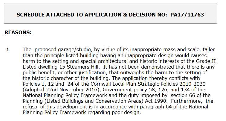 - The proposed garage/studio, by virtue of its inappropriate mass and scale, taller than the principle listed building having an inappropriate design would causes harm to the setting and special architectural and historic interests of the Grade II Listed dwelling 15 Steamers Hill. It has not been demonstrated that there is any public benefit, or other justification, that outweighs the harm to the setting of the historic character of the building. The application thereby conflicts with Policies 1, 12 and 24 of the Cornwall Local Plan Strategic Policies 2010-2030 (Adopted 22nd November 2016), Government policy 58, 126, and 134 of the National Planning Policy Framework and the duty imposed by section 66 of the Planning (Listed Buildings and Conservation Areas) Act 1990. Furthermore, the refusal of this development is in accordance with paragraph 64 of the National Planning Policy Framework regarding poor design.
