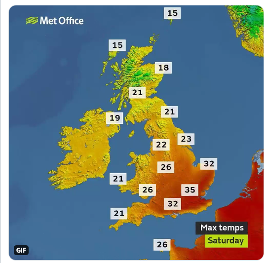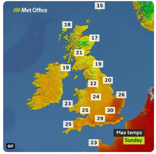 Temperatures are expected to soar to 37C (98.6F) by the end of the week, caused by hot air moving in from southern Europe.