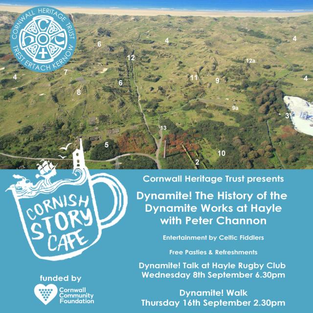 Join Cornwall Heritage Trust at Hayle Rugby Club on Wednesday 8th Sept at 6.30pm for a talk about the History of the Dynamite Works at Hayle (Upton Towans).