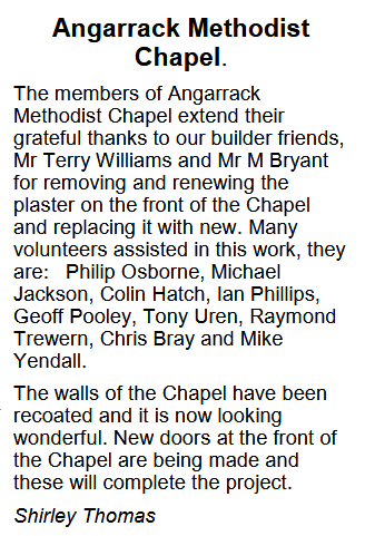 The members of Angarrack Methodist Chapel extend their grateful thanks to our builder friends, Mr Terry Williams and Mr M Bryant for removing and renewing the plaster on the front of the Chapel and replacing it with new.